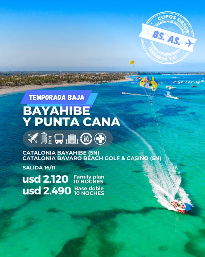 Aprovechá esta oportunidad para vivir dos experiencias distintas en República Dominicana: la tranquilidad de Bayahibe y la diversión de Punta Cana. Disfrutá de 10 noches de hospedaje con régimen Todo Incluido (All Inclusive) en hoteles de la cadena Catalonia, con cupos confirmados desde Buenos Aires.